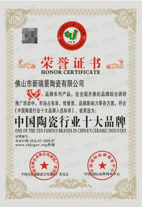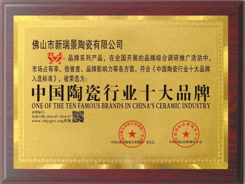 新瑞景陶瓷凭借其卓越品质、创新设计和品牌影响力,成功荣获陶瓷十大品牌称号,彰显了行业领先地位。